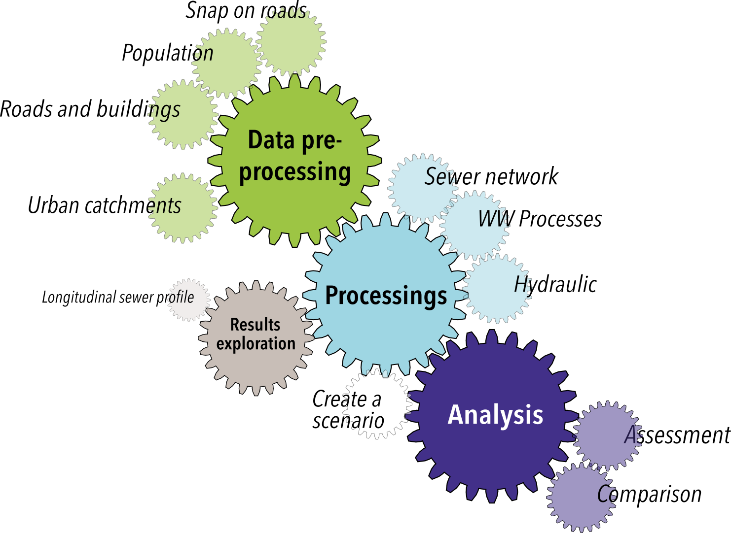 Sewer networkfor pre-designing a sanitation sewer network (separate sewer system, wastewater only) in an area without an existing network, using pysewer.Processesfor preliminary sizing of wastewater treatment systems of the constructed wetlands type, using wetlandoptimizer.Hydraulicfor estimating the volumes generated by the different urban catchments in an area.Create a scenariothat interfaces with the Processings and Analysis modules type and allows you to create scenario objects that can then be assessed and compared.