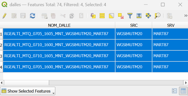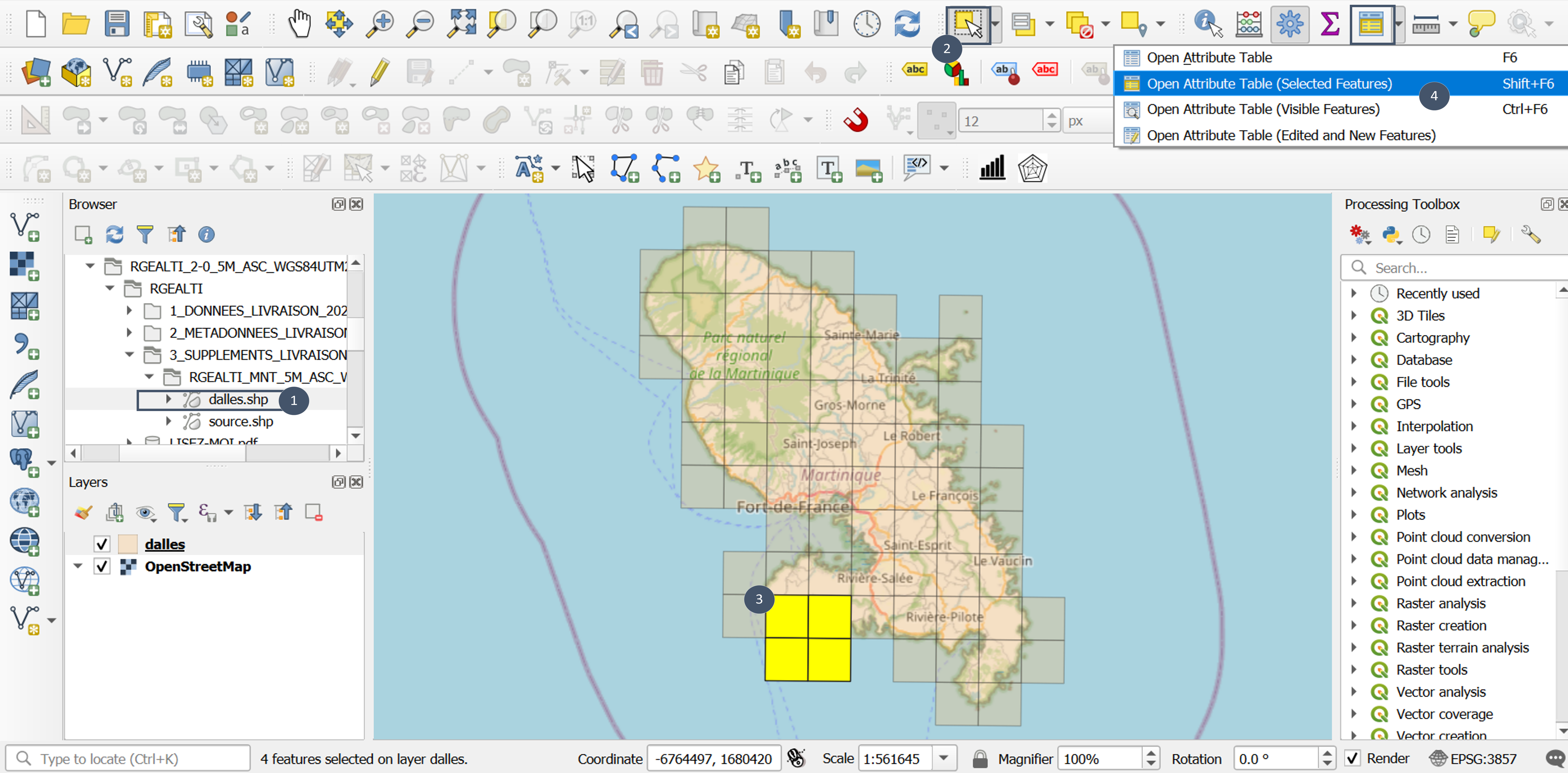 In this case, four tiles cover the area: RGEALTI_MTQ_0705_1600_MNT_WGS84UTM20_MART87, RGEALTI_MTQ_0710_1600_MNT_WGS84UTM20_MART87, RGEALTI_MTQ_0705_1605_MNT_WGS84UTM20_MART87 and RGEALTI_MTQ_0710_1605_MNT_WGS84UTM20_MART87.