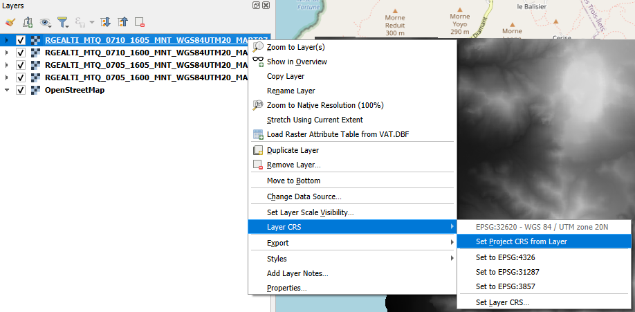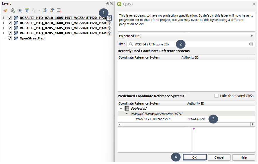 3. Identify the associated CRS (Coordinate Reference System). It is usually indicated in the file names: here WGS184UTM20, i.e., EPSG:32620 – WGS 84 / UTM zone 20N in QGIS.