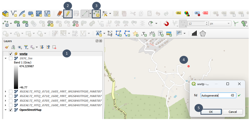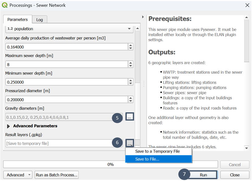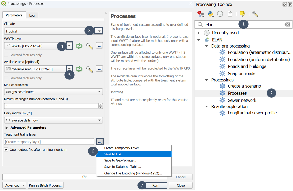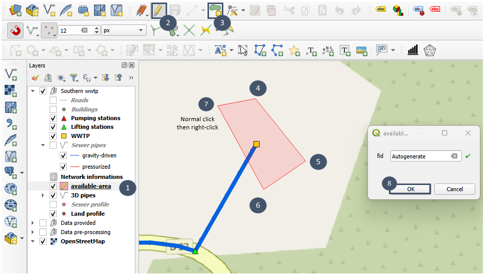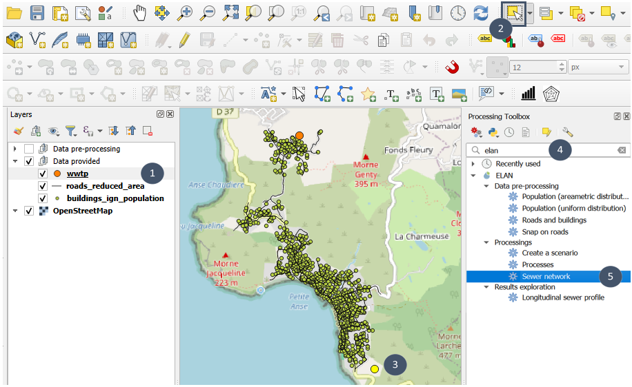 elanin the Processing Toolbox (marker 4) and selectSewer network(marker 5).