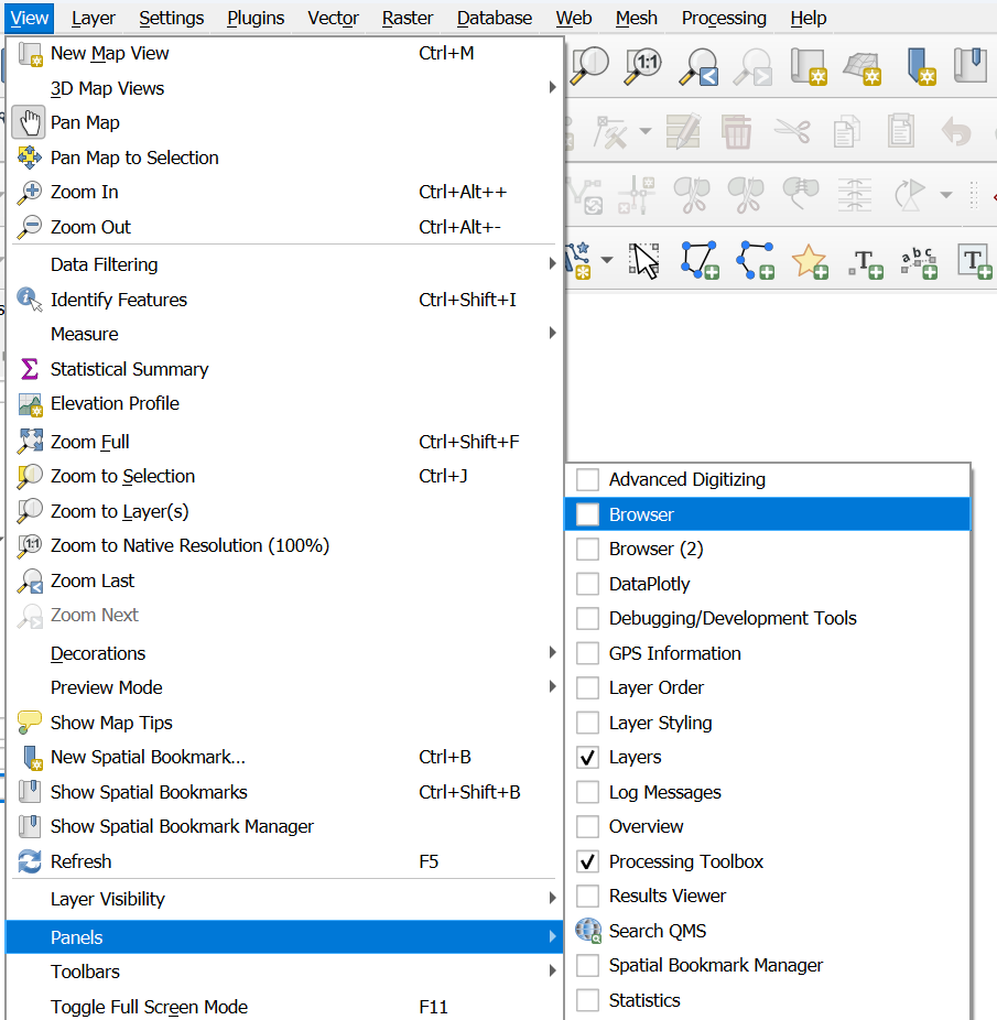 2. Identify the DEM tiles covering your area of interest by loading them into your QGIS project (via the Browser panel).