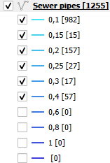To know exactly how many features fit each diameter: right-click on Sewer pipes and tick Show Feature Count. You will get something of this kind: