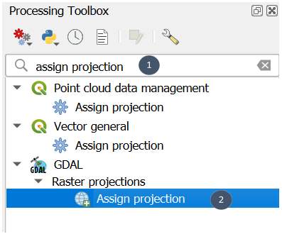 Assign projectiontool from GDAL in the Processing Toolbox (markers 1 and 2).