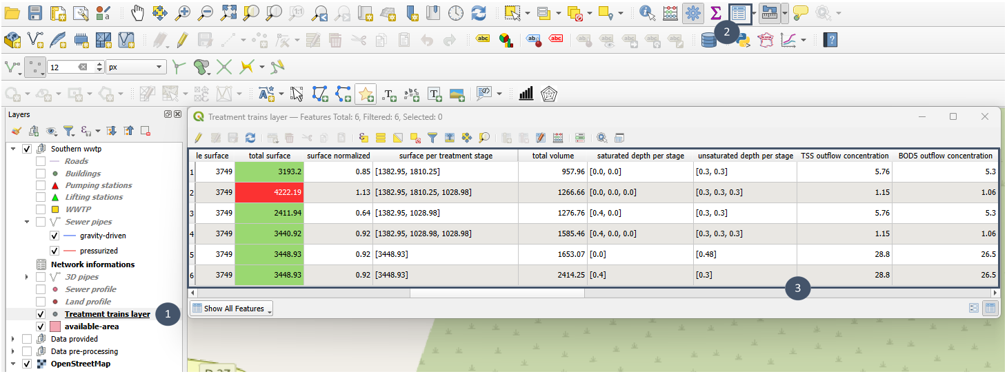 Treatment trains layer(marker 1).Click the Open attribute table icon (marker 2).