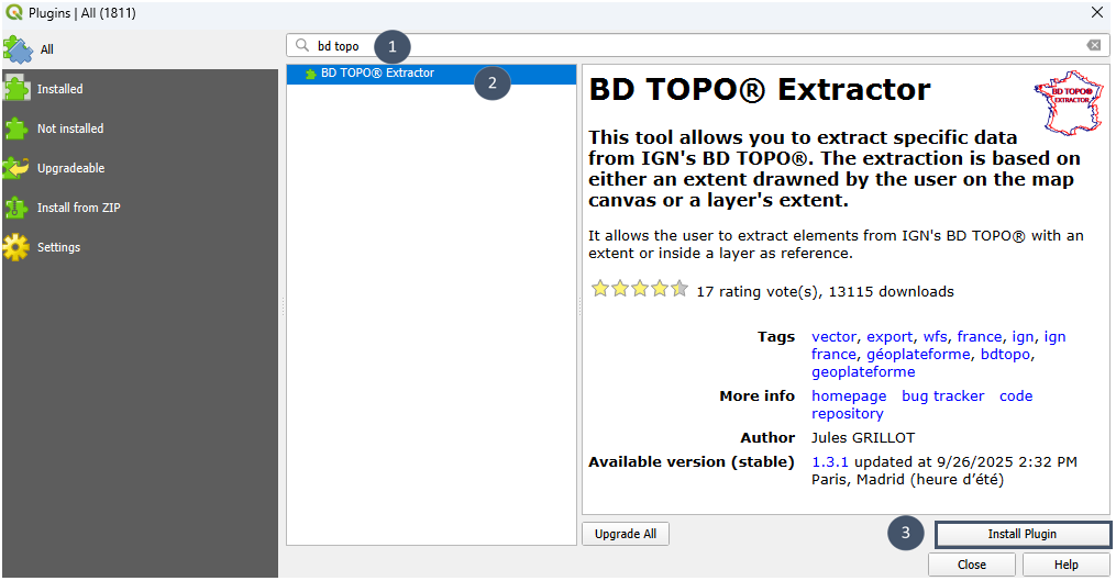 Prerequisite: Install the BD TOPO® Extractor plugin via the QGIS Plugin Manager.