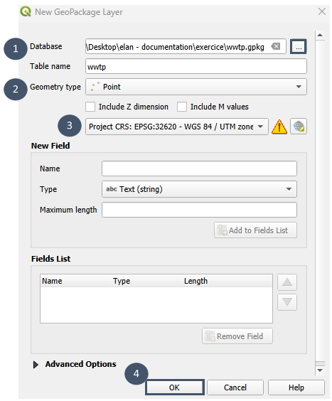 2. Chose a storage location and name the layer (marker 1), then set its type to Point (marker 2).