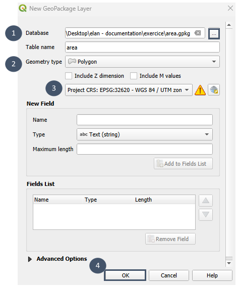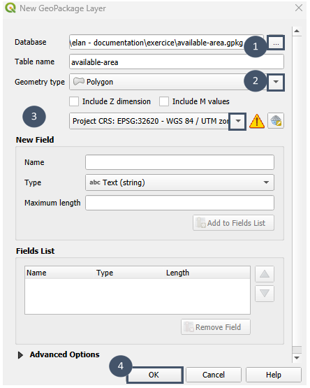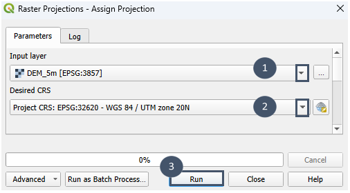 3. For the CRS, choose the project CRS (here EPSG:32620 – WGS 84 / UTM zone 20N), then run (markers 3 and 4).