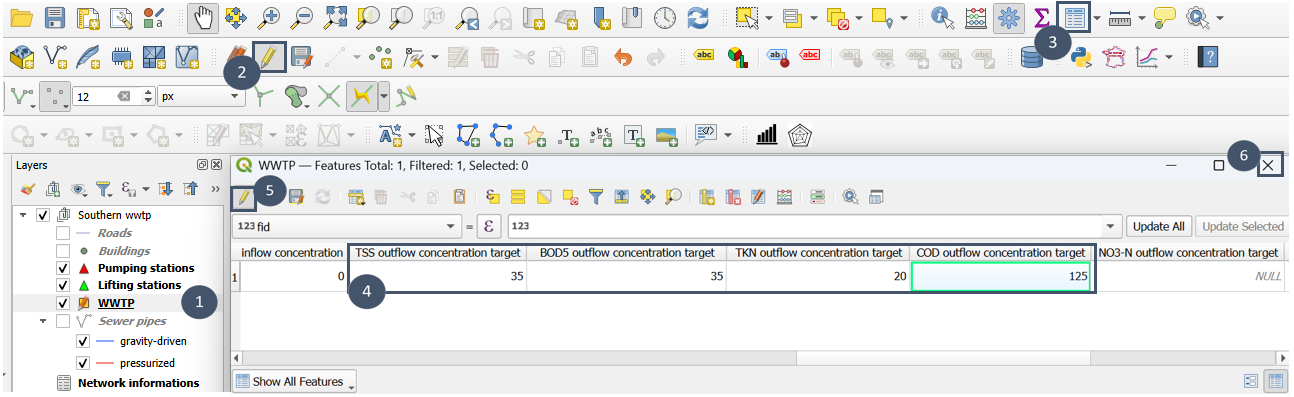 Exit edit mode (marker 5) and close the attribute table (marker 6).