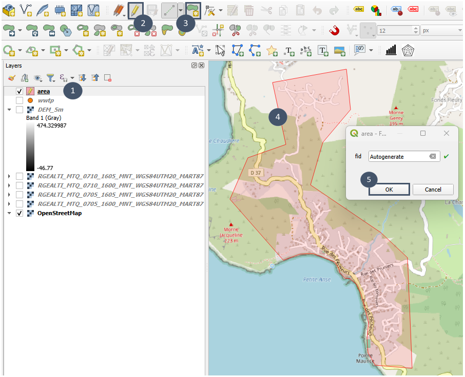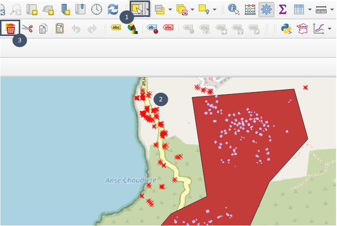 6. Edit the layer (pencil icon), select (markers 1 and 2), then delete the few entities located outside the area (marker 3). Save before exiting edit mode.