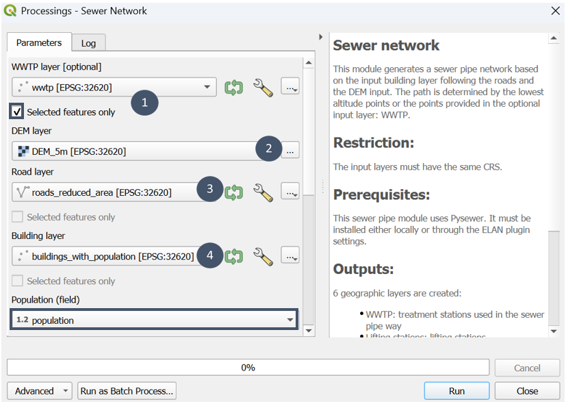 Specify the 4 geographic layers (markers 1 to 4). Be sure to tick Selected features only to consider only the WWTP in the south of the area.