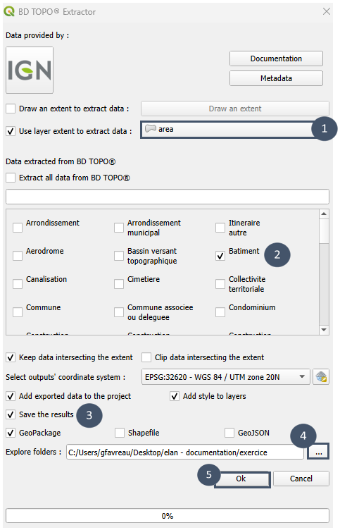 Step 3: Retrieve roads and buildings - using the IGN plugin (option 1)¶