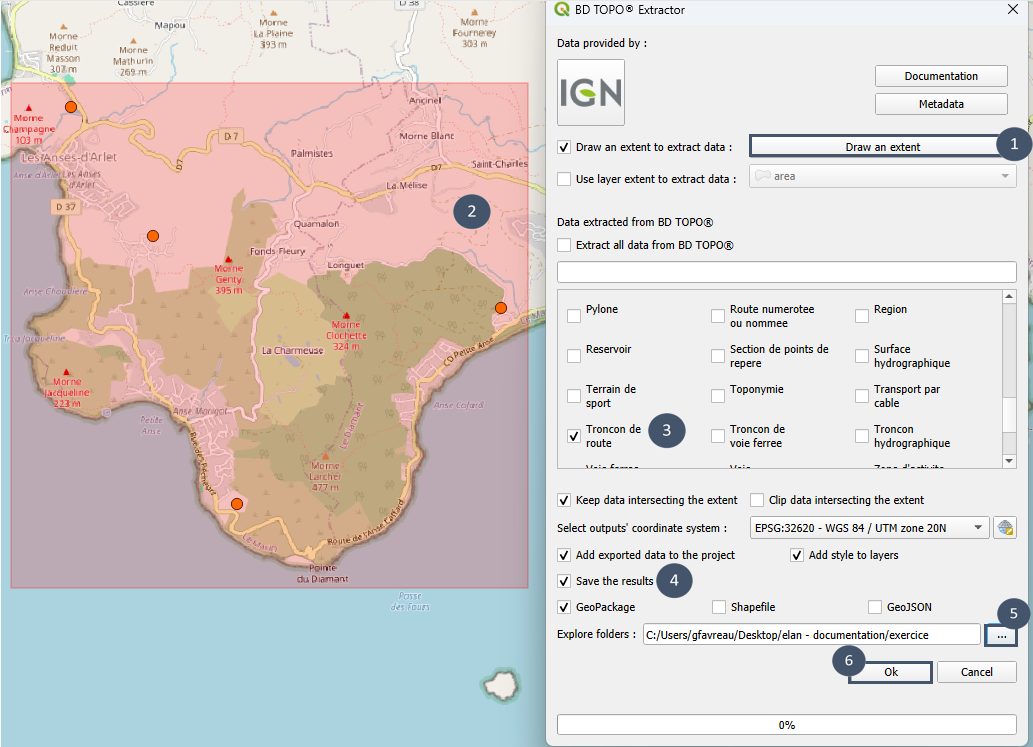 2. Delimit the area to extract on the map (markers 1 and 2), tick Tronçon de route (marker 3), and specify the output folder (markers 4 and 5) before clicking OK (marker 6).