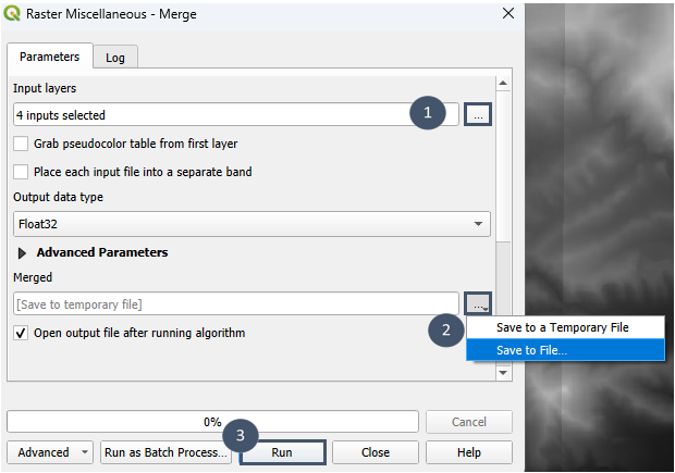 6. Fill in the inputs (marker 1) and save the output to a .tif file (marker 2) before running (marker 3).