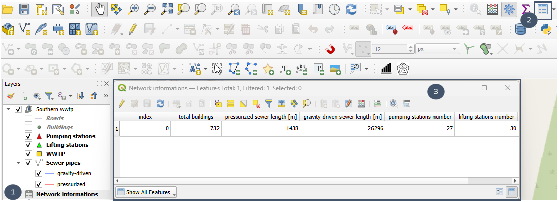 Network informationlayer (marker 1).Click on the Open attribute table icon (marker 2).