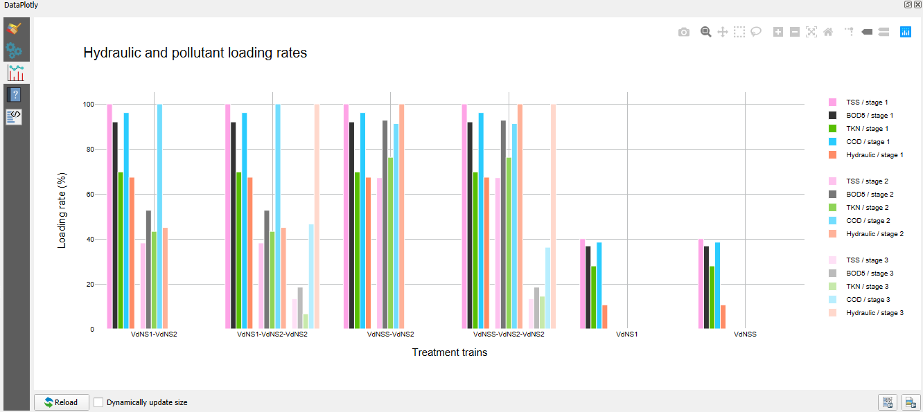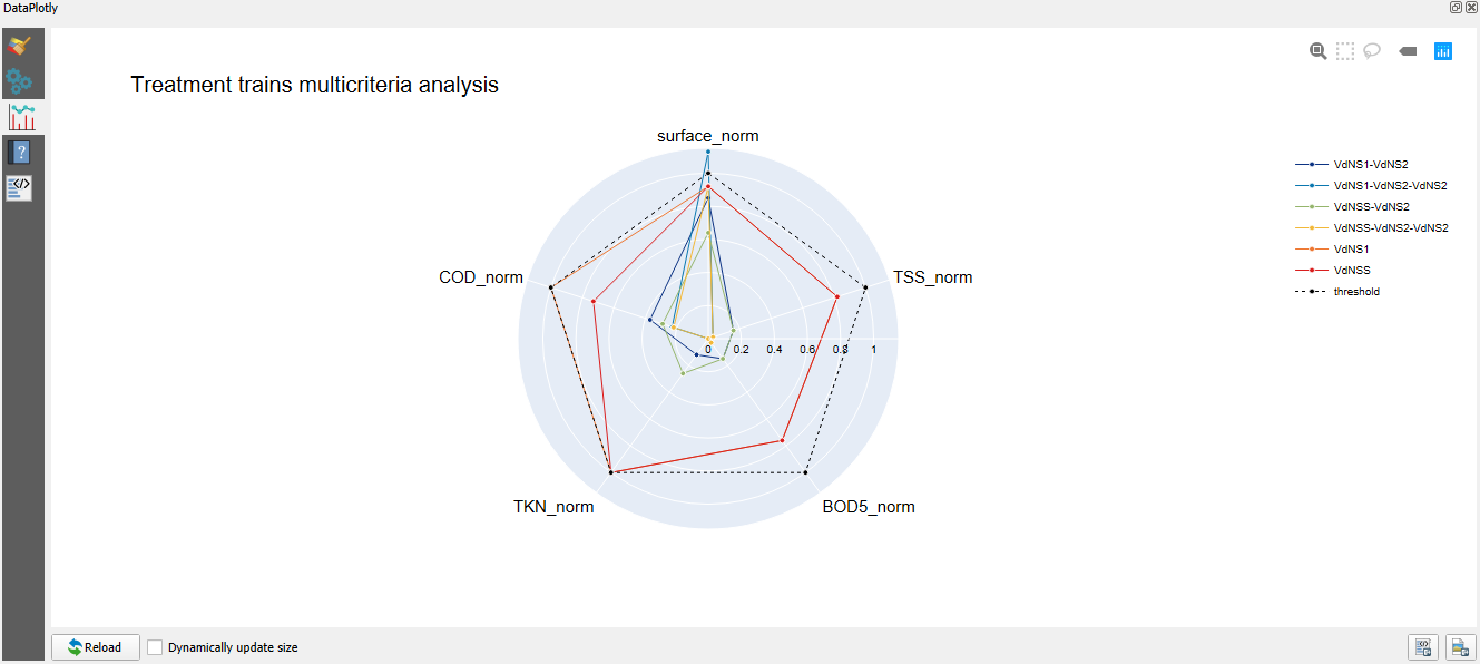 To help you to pre-select a treatment train, you can display graphical représentations (radar plot and bar plot) where all possible treatment trains for this discharge point are represented (see here for more details).