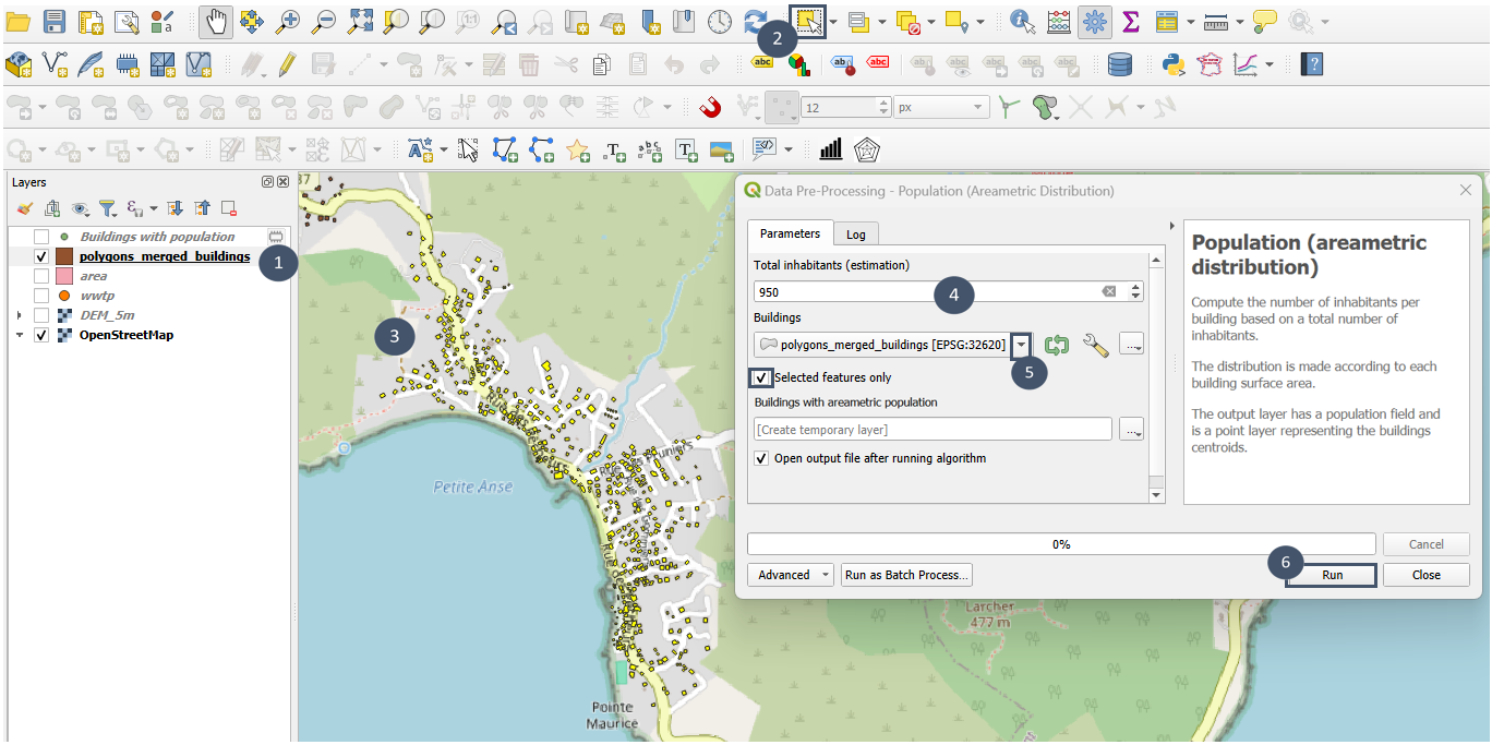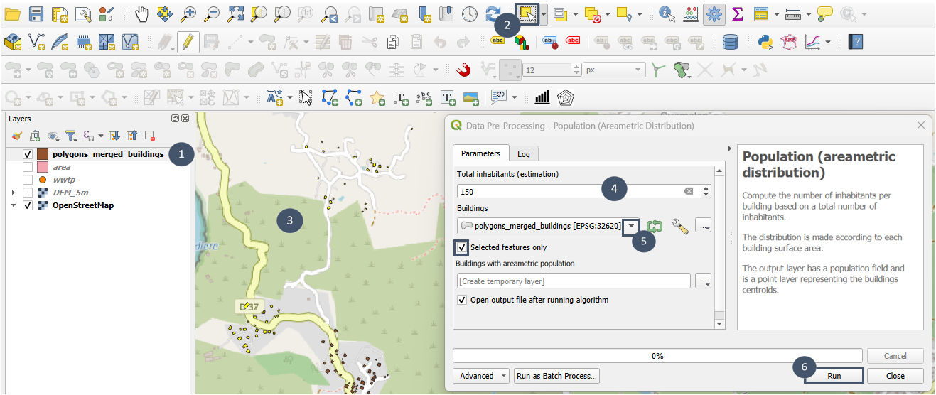 3. Enter 150 for the Total inhabitants of the area (marker 4), tick Selected features only after selecting the building layer (marker 5), then run (marker 6).
