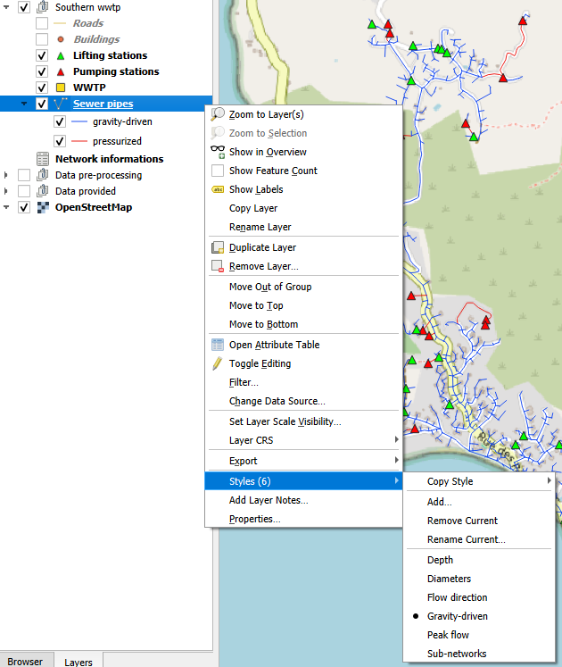 To organize your workspace with the different layers, you can create groups (e.g., Data Pre-processing, Data Provided, and Sewer Network - Southern WWTP).