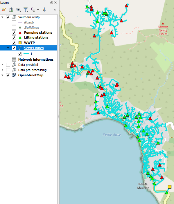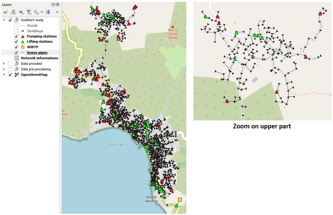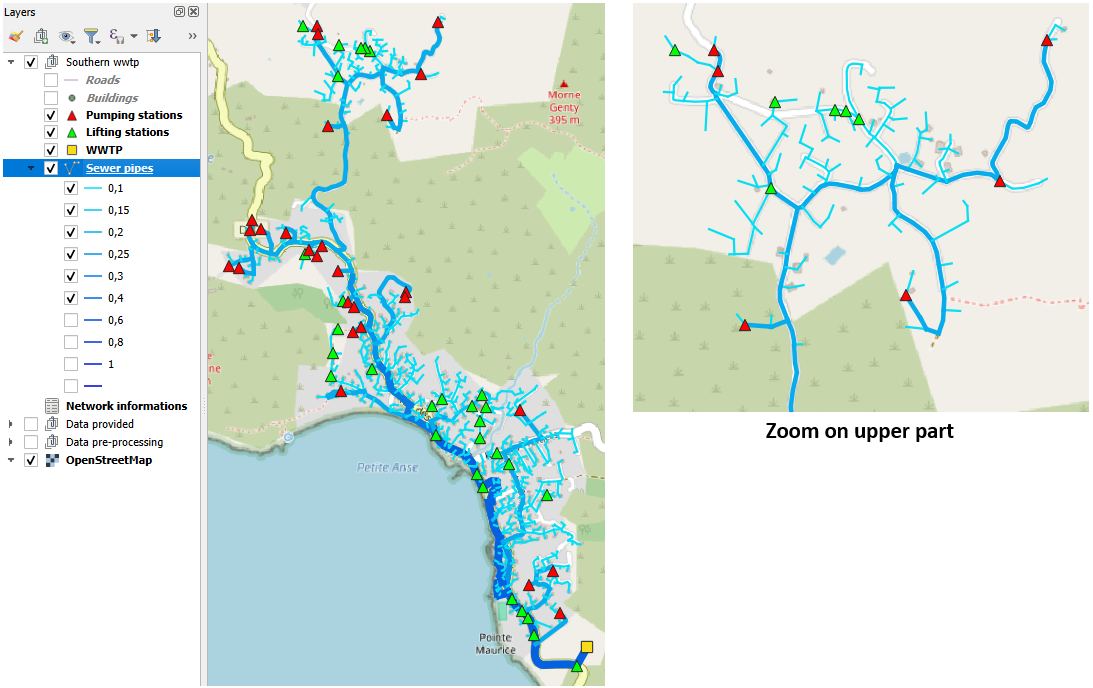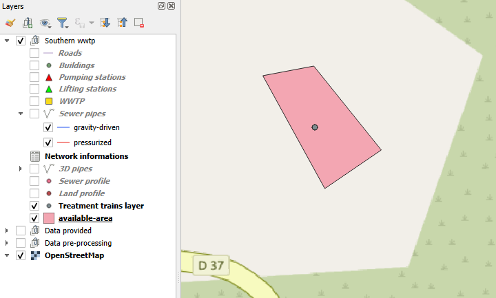 Roads and buildingsmodule on zone _elargie layer (in zones.gpkg) and then a manual post-processing (elimination of impassable roads);wwtp that contains the 4 possible locations for wastewater treatment plants.