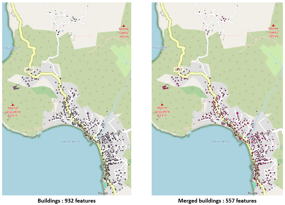 By applying the Roads and Buildings module <routes> to the area defined earlier, the following outputs are obtained for buildings: