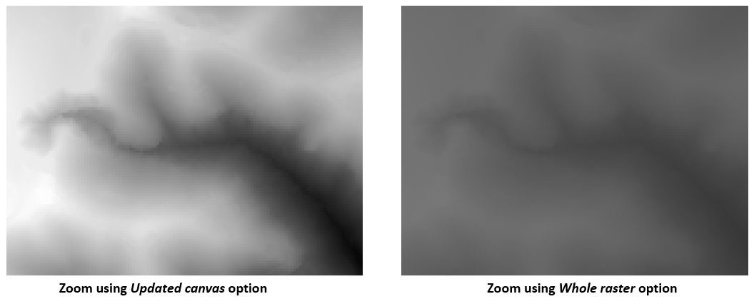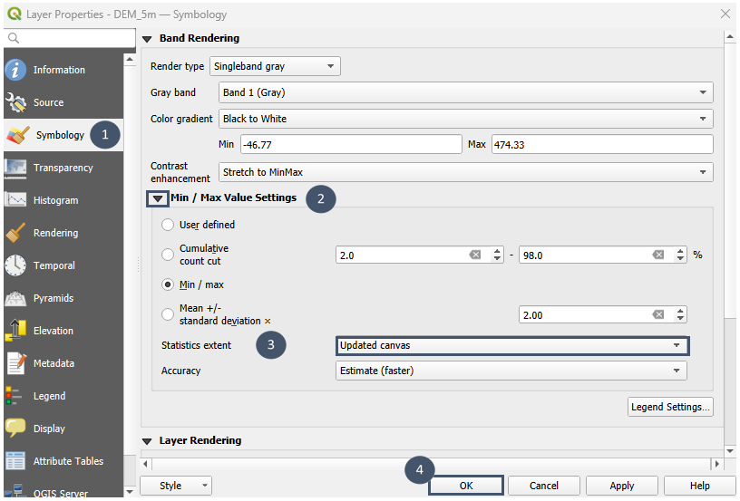 In Min/Max Value Settings (marker 2), change the Statistics extent setting to Updated Canvas instead of the default Whole raster (marker 3).