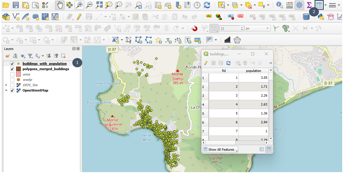 Select the layer (marker 1) and open the attribute table (marker 2).