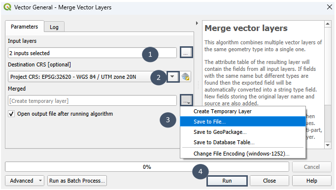 2. Select the two layers (marker 1), choose the project CRS (marker 2), set the output file (marker 3), then run (marker 4).