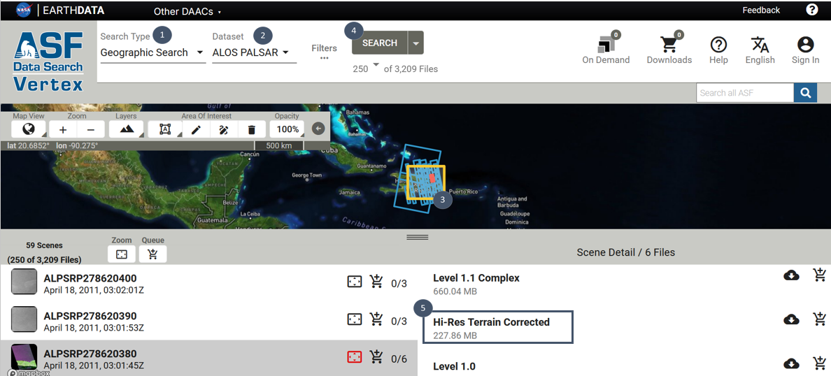 Among the suggested tiles on the left, check if there is one where a file High-Res Terrain Corrected can be downloaded (marker 5).