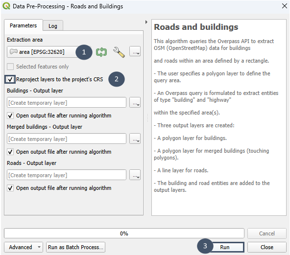 2. Specify the polygon layer that defines the extraction area (marker 1), tick Reproject layers to the project’s CRS (marker 2), then run (marker 3).