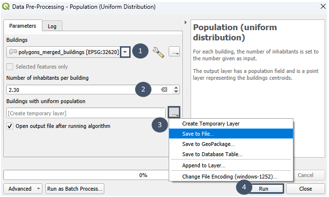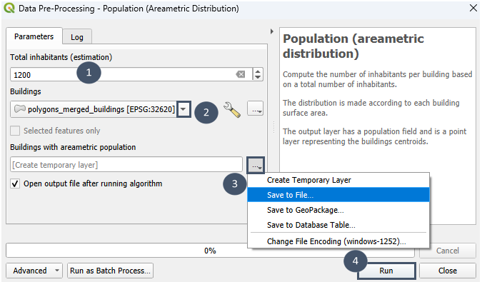 2. Select the building layer (marker 1), specify a mean number of inhabitants per building (marker 2), set an output file (marker 3), then run (marker 4).