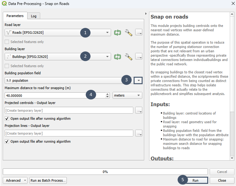 2. Select the road layer (marker 1) and the building layer (marker 2), specify the field corresponding to population (marker 3), if needed adjust the default value for maximum distance authorized for snapping (marker 4), then run (marker 5).
