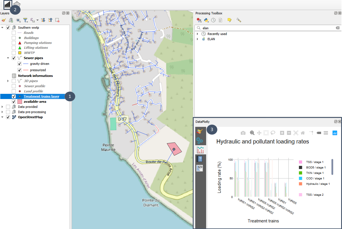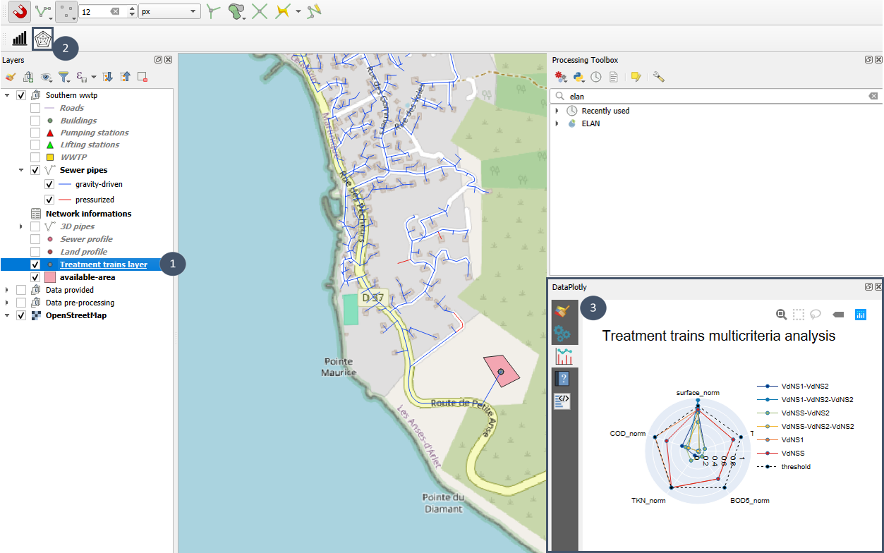 1. Click on your layer Treatment trains layer in the Layers panel (marker 1).
