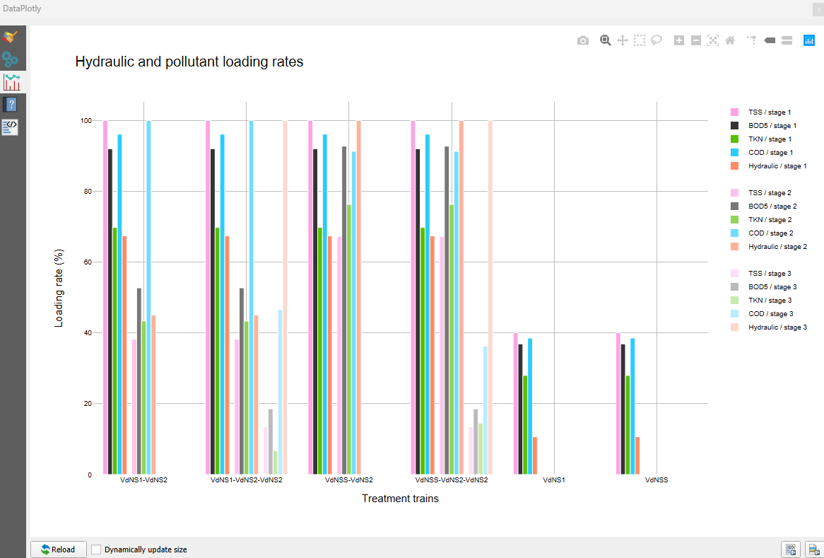 The bar plot allows you to identify the element.s that were limiting during the treatment train optimisation (100 % loading rate) and have a quick idea whether the treatment train is adaptative or not in case of evolution of the context (increase of population for instance).
