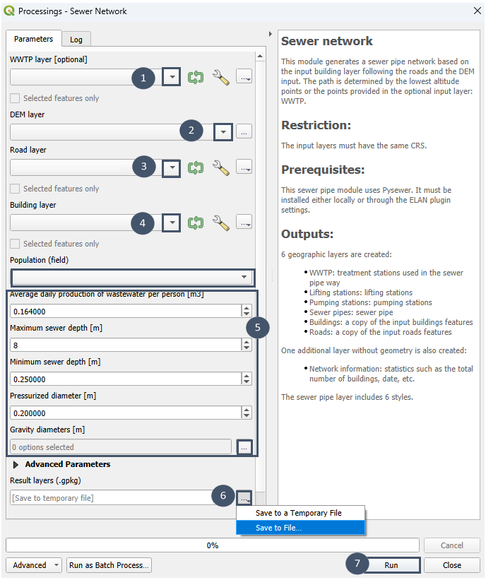 average daily production of wastewater per person: [m³].maximum sewer depth: [m], depends on the geological context.minimum sewer depth: [m], generally conditioned by the risk of frost.pressurized diameter: [m], only one permitted diameter.gravity diameters: [m], to be chosen from the proposed options (0.1, 0.15, 0.2, 0.25, 0.3, 0.4, 0.6, 0.8 and 1.0). All 9 options may be considered, or only a subset of them.