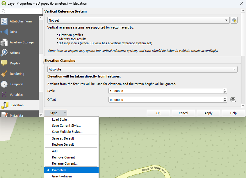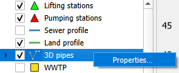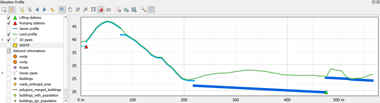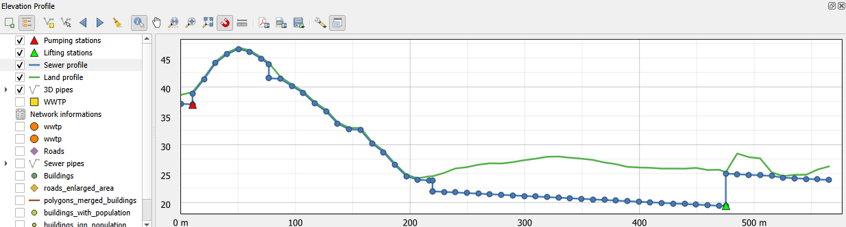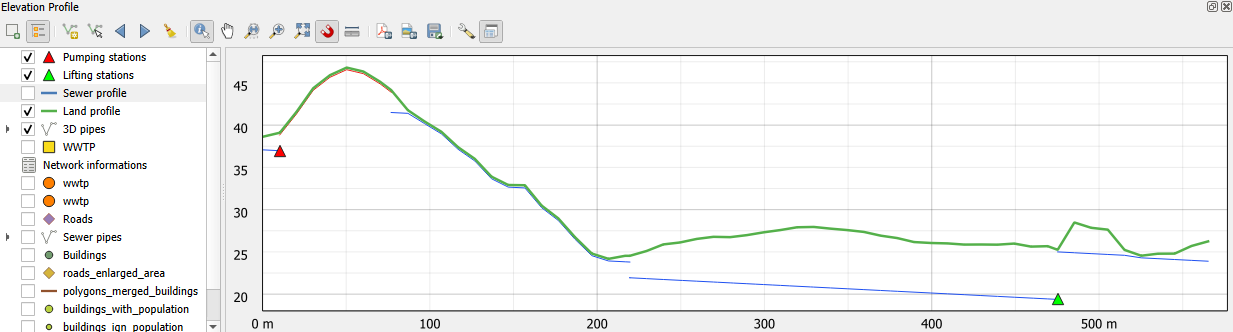 Land profile: point layer containing a sampling of DEM values (ground elevation) along the pipe profile.Sewer profile: point layer whose points overlap with those of theLand profilelayer in the XY plane, but correspond to pipe elevation.3D pipes: Z-enabled line layer created from a sampling of theSewer pipeslayer (retains styles and attributes).