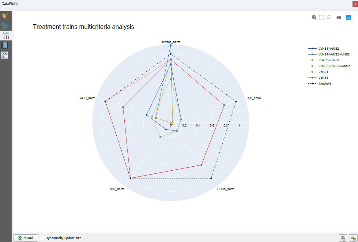 Compliance with required outflow concentrations and available surface are two fairly obvious criteria that will allow you to pre-select a treatment train for each discharge point. The radar plot integrated to Elan allows to graphically visualize the several treatment trains based on these criteria and thus facilitate their comparison.