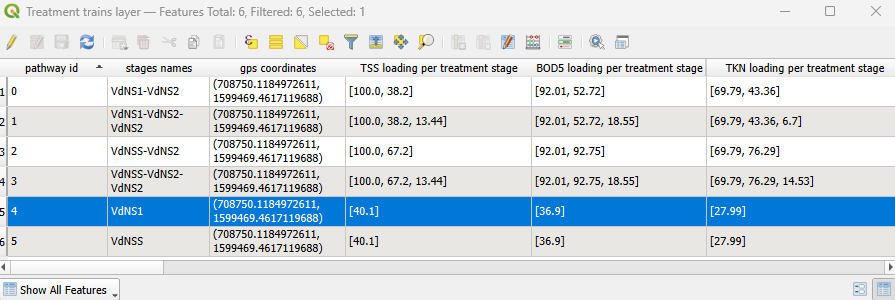 1. Open the attribute table of your Treatment trains layer and select one treatment train per discharge point. For example here, the VdNS1 treatment train (1 unique treatment train selected because only 1 discharge point in this scenario).
