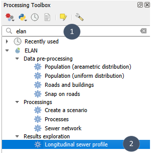 1. Search for elan in the Processing Toolbox and select Longitudinal sewer profile.