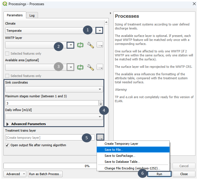6. Choose a save location and name for the output file (marker 5) and then run (marker 6).