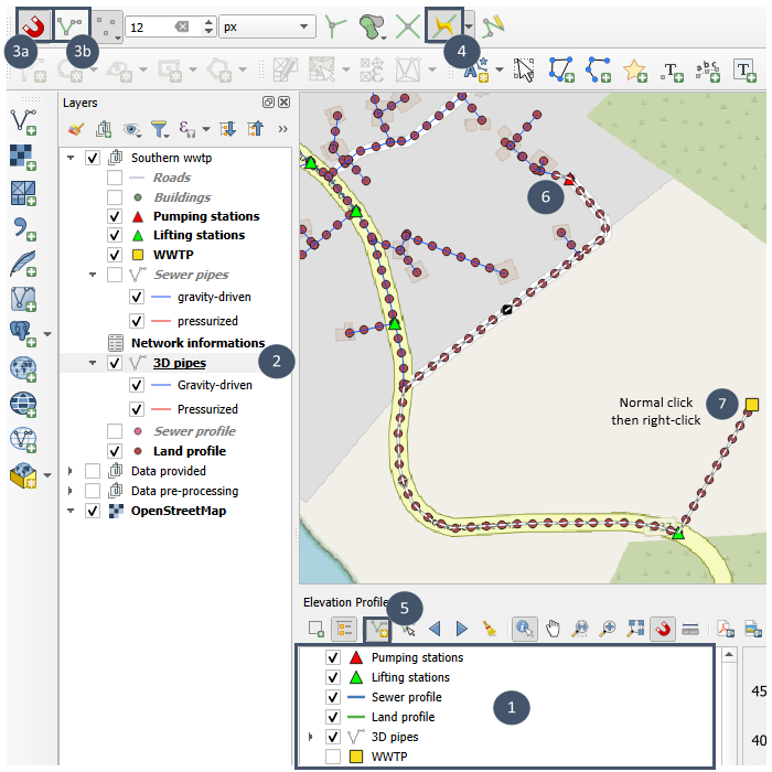 3D pipeslayer (marker 2).Enable snapping (marker 3a) on the active layer (marker 3b).
