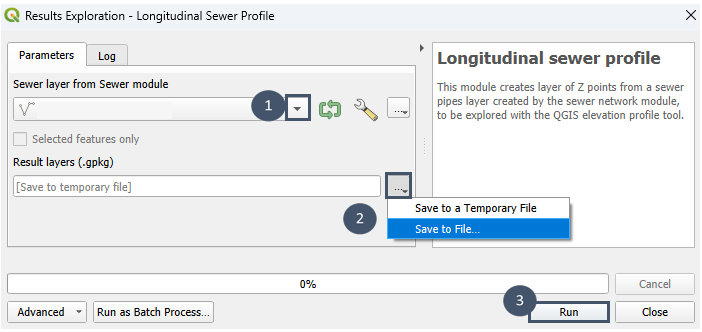 2. Provide the sewer pipes layer (marker 1), choose a location and a name for the output file (marker 2), then run (marker 3).