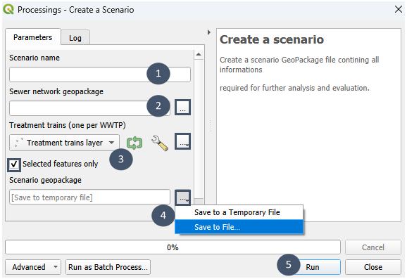3. Give a name to your scenario (marker 1), specify the Sewer pipes layer to be considered (marker 2), indicate the Treatment trains layer and compulsory tick Selected features only (marker 3) to consider only the pre-selected treatment train(s).
